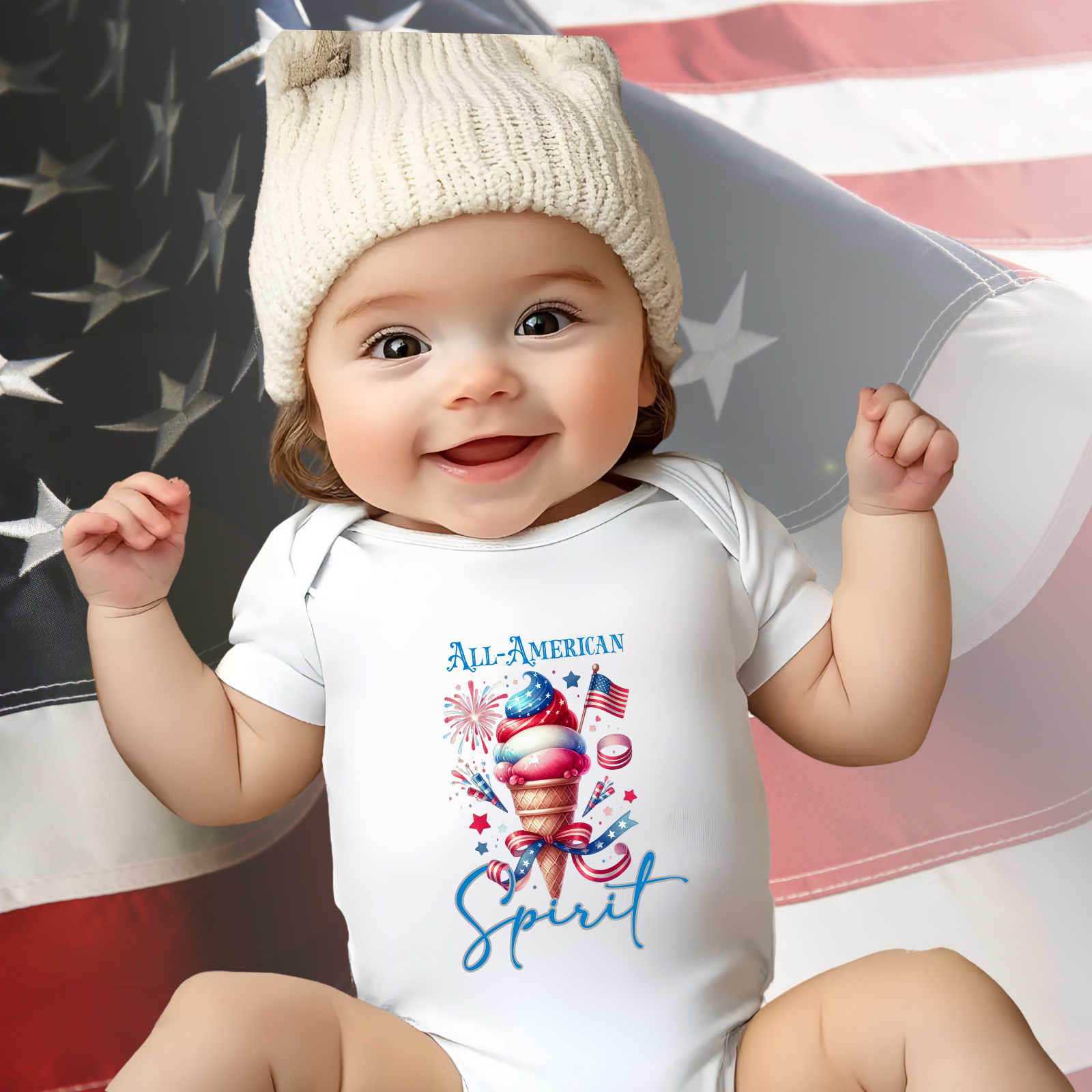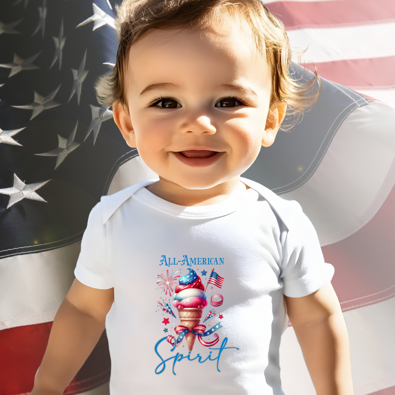 Dress your little one in sweet patriotic style with the All-American Spirit Infant Short Sleeve Onesie. Made for cozy comfort and everyday cuteness, this red white and blue baby outfit is perfect for summer celebrations, Fourth of July festivities, and family photos. The playful, retro-inspired design adds a fun twist to your baby’s patriotic wardrobe. Soft, durable, and easy to change, this infant patriotic onesie is a must-have for showcasing star-spangled charm from day one.