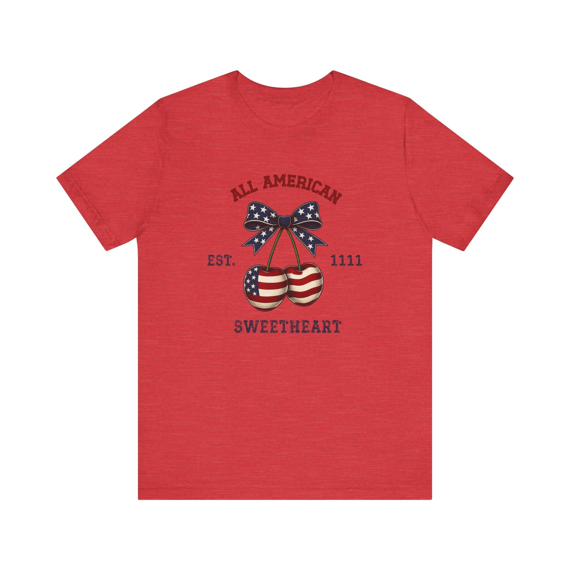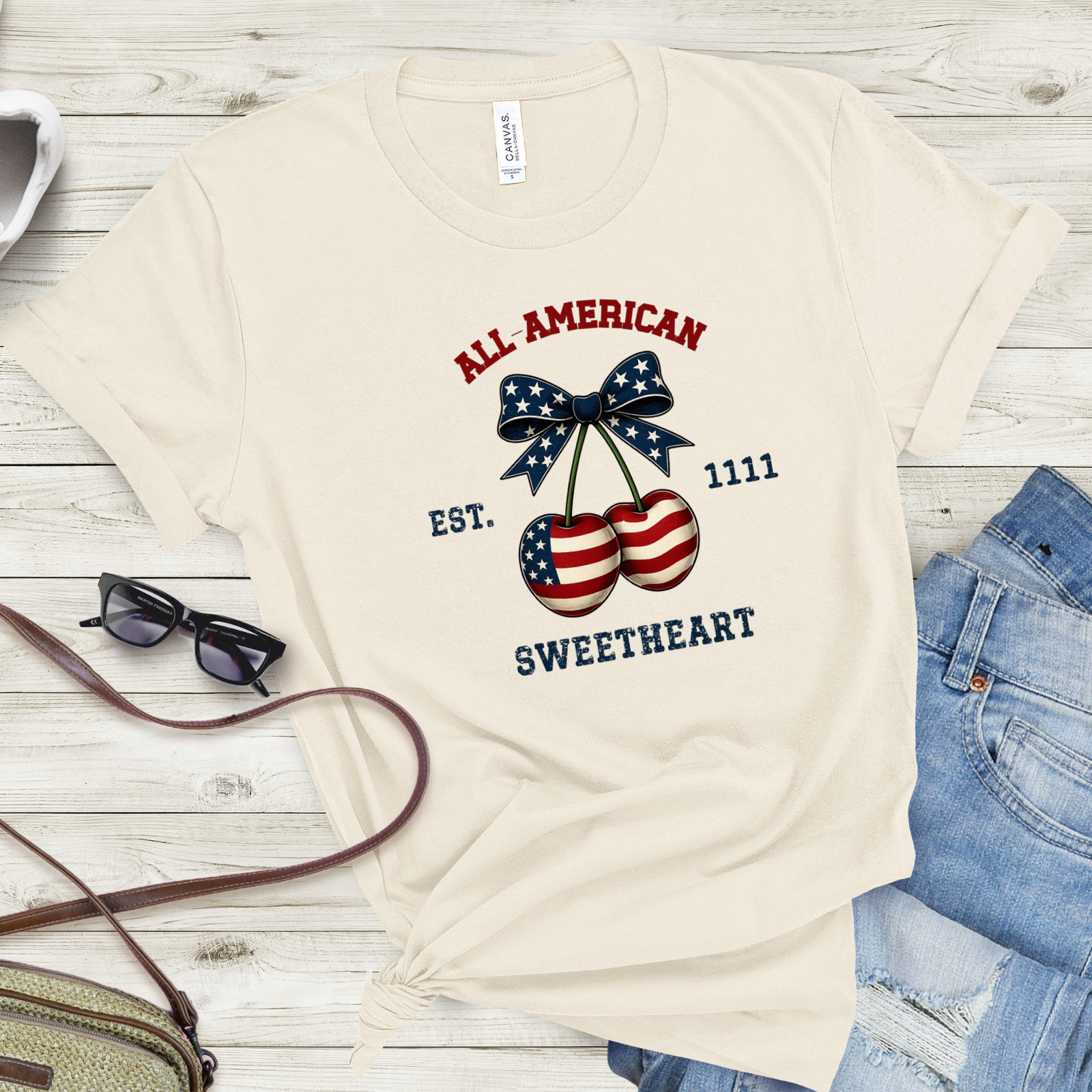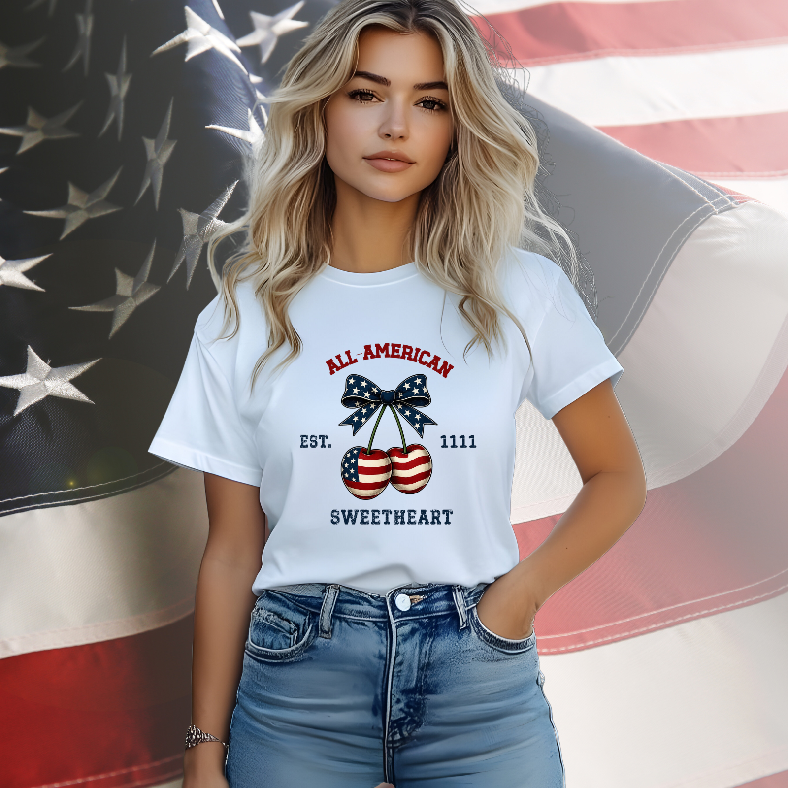 Celebrate your patriotic charm with the All-American Sweetheart T-Shirt, a must-have for summer celebrations, backyard barbeques, and festive gatherings. Made with soft, breathable fabric, this tee offers all-day comfort while showing off your love for the red, white, and blue. Its playful yet stylish design makes it perfect for pairing with denim shorts or your favorite jeans. Stand out with a look that blends classic Americana with a fun twist, making it a seasonal favorite.