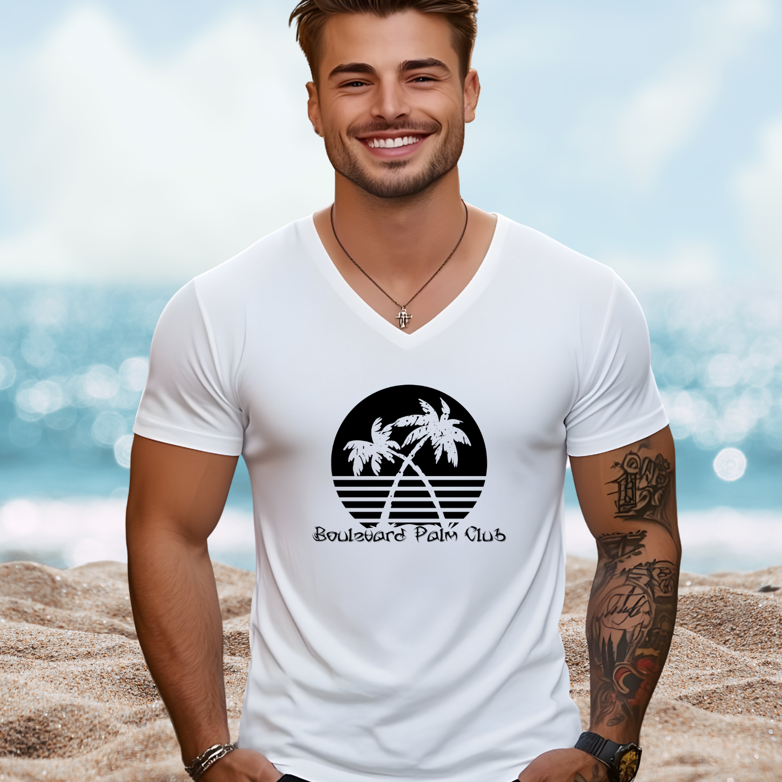 Elevate your warm-weather wardrobe with the Boulevard Palm Club V-Neck Tee, a chic essential for anyone who loves relaxed fashion with a coastal edge. This flattering tee is soft, breathable, and perfect for summer adventures, from beachside strolls to casual nights out. Its versatile design pairs effortlessly with shorts or jeans, making it a go-to piece for any occasion. A stylish graphic tee that captures the spirit of sunshine, palm trees, and carefree living.