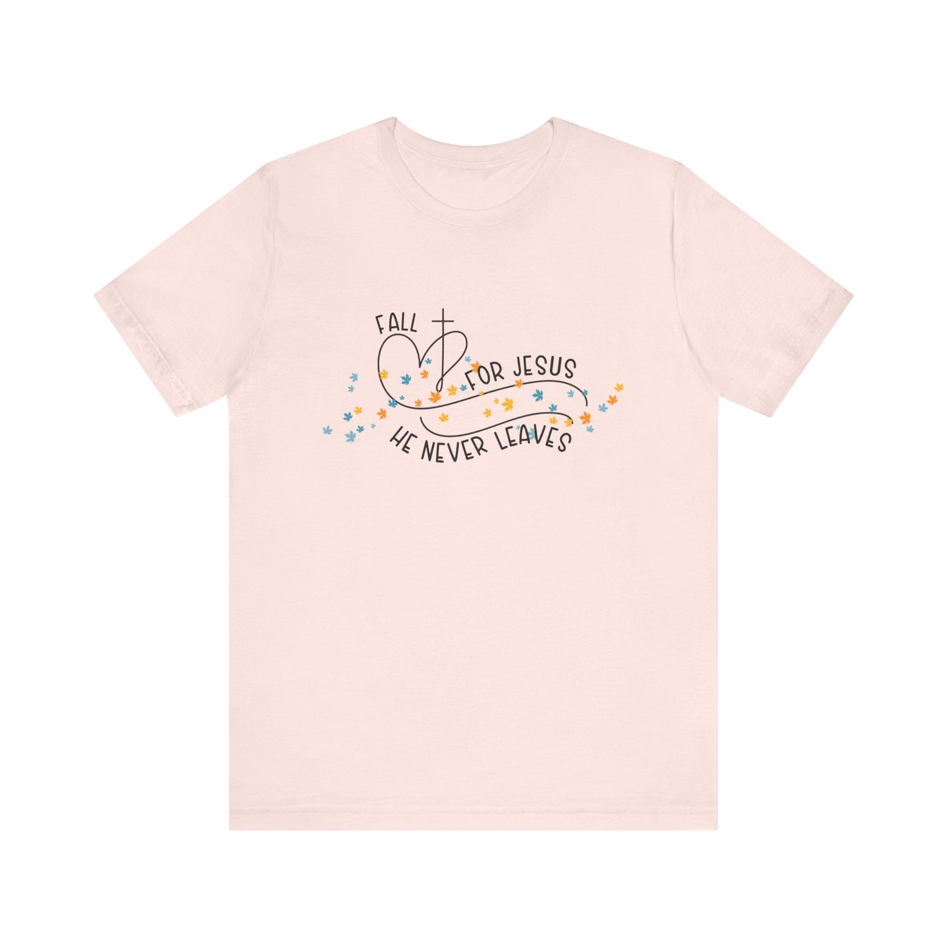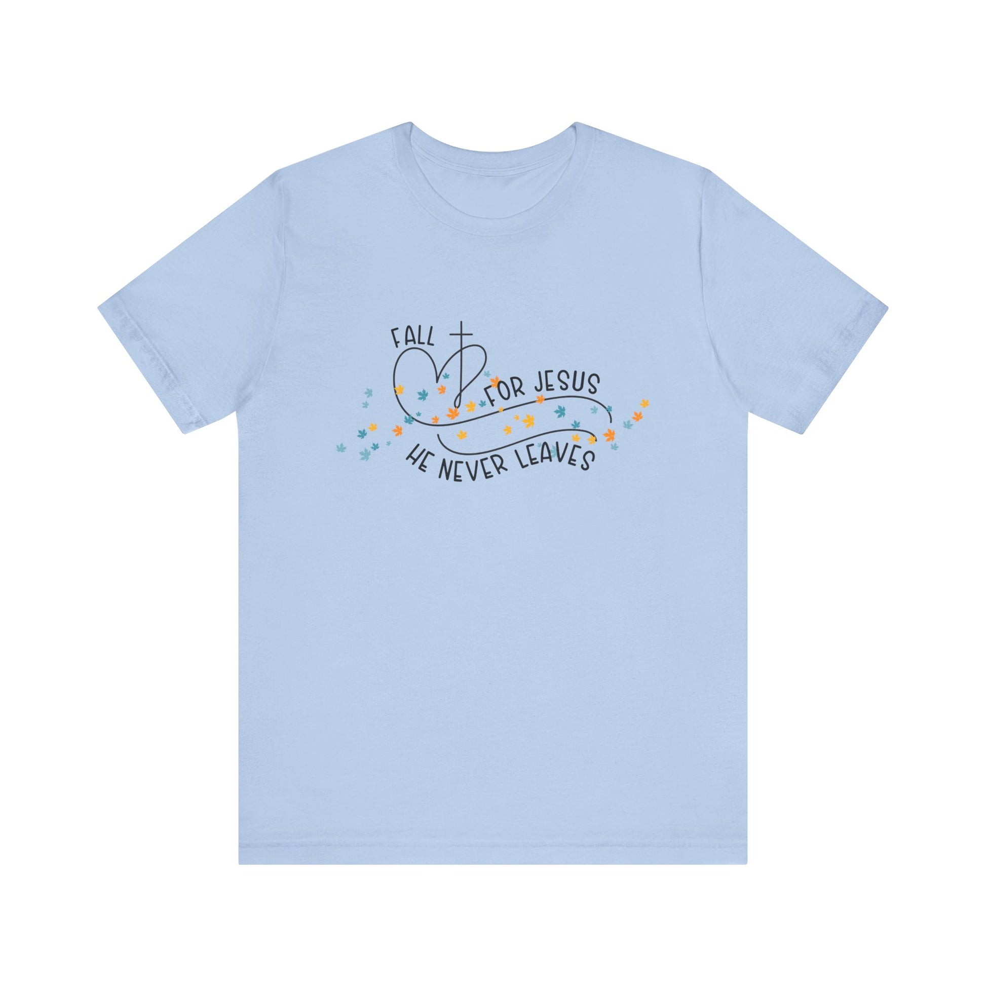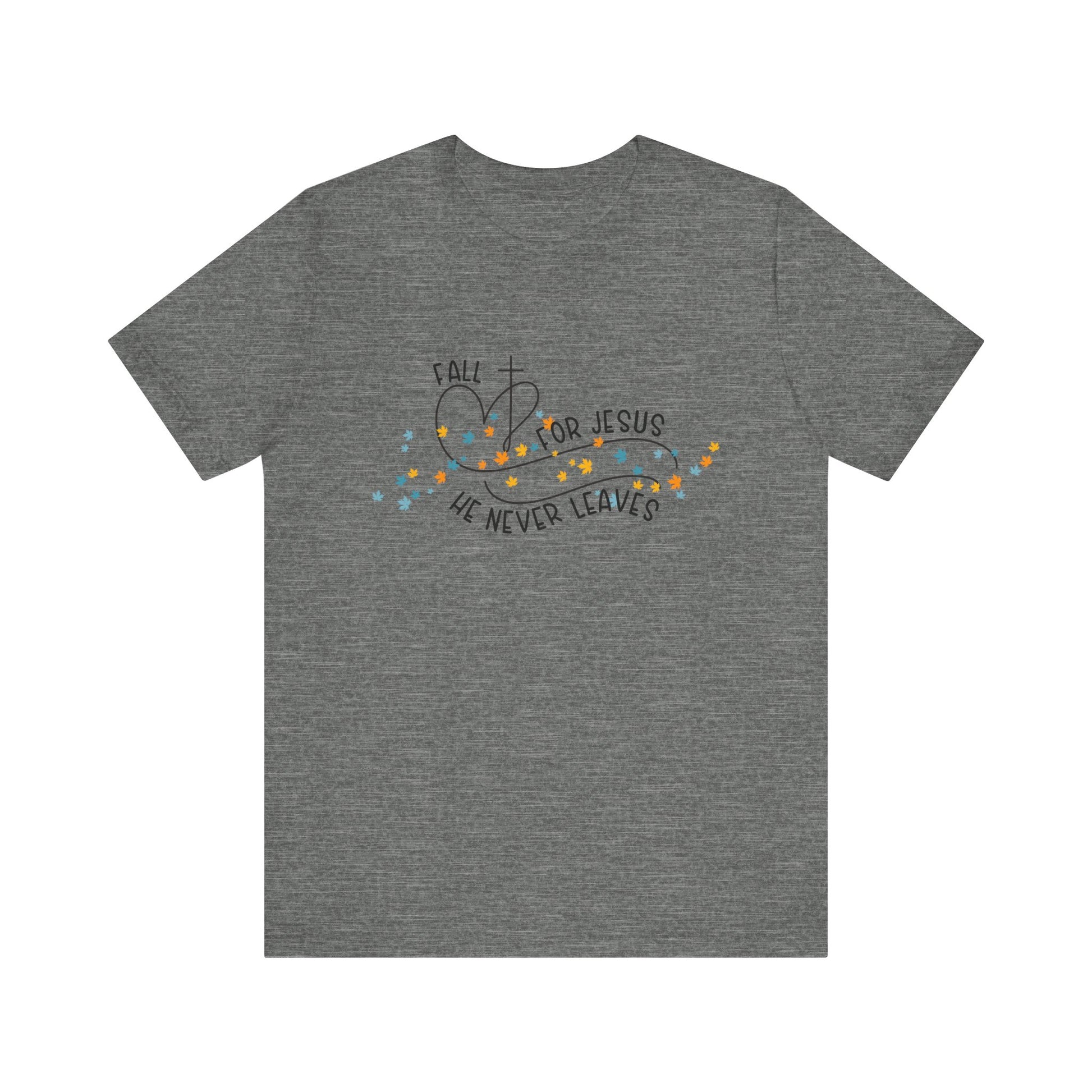 Show your faith and love for the season with our Fall for Jesus, He Never Leaves T-Shirt. Perfect for autumn gatherings or casual days out, this fall tee combines comfort, style, and a heartfelt message. Its soft fabric and flattering fit make it ideal for layering under cozy cardigans or wearing on its own. Celebrate gratitude, faith, and the beauty of fall with a shirt that shares your love for Jesus and autumn blessings.