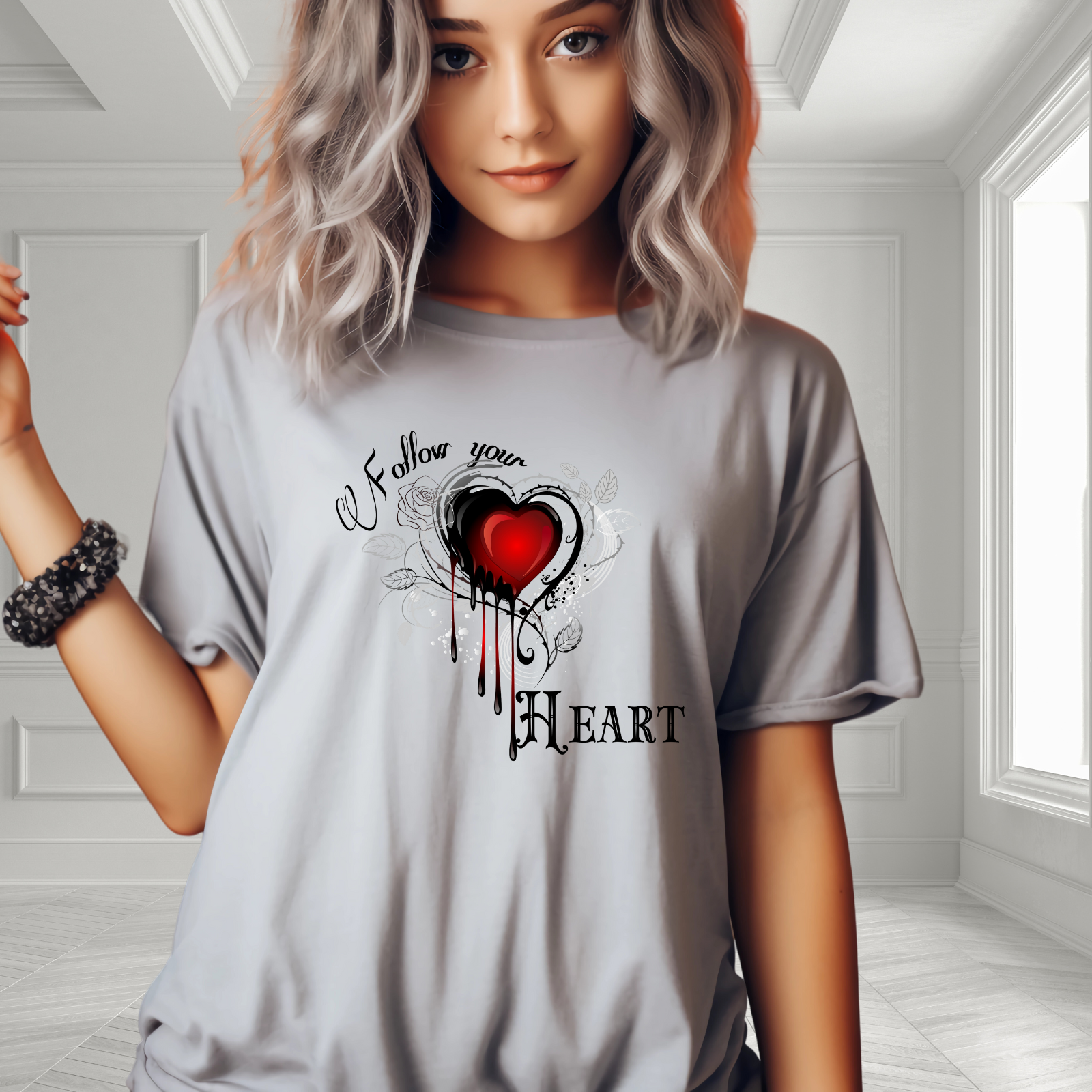 Make a bold statement with the Follow Your Heart T-Shirt, designed for those who embrace their unique style. This shirt combines edgy graphic design with a comfortable, everyday fit, perfect for adding personality to your casual wardrobe. Crafted from soft, breathable fabric, it’s ideal for any occasion, whether you're out with friends or enjoying a relaxed day. Show off your passion and confidence while staying effortlessly stylish in this must-have tee that speaks to your bold spirit.