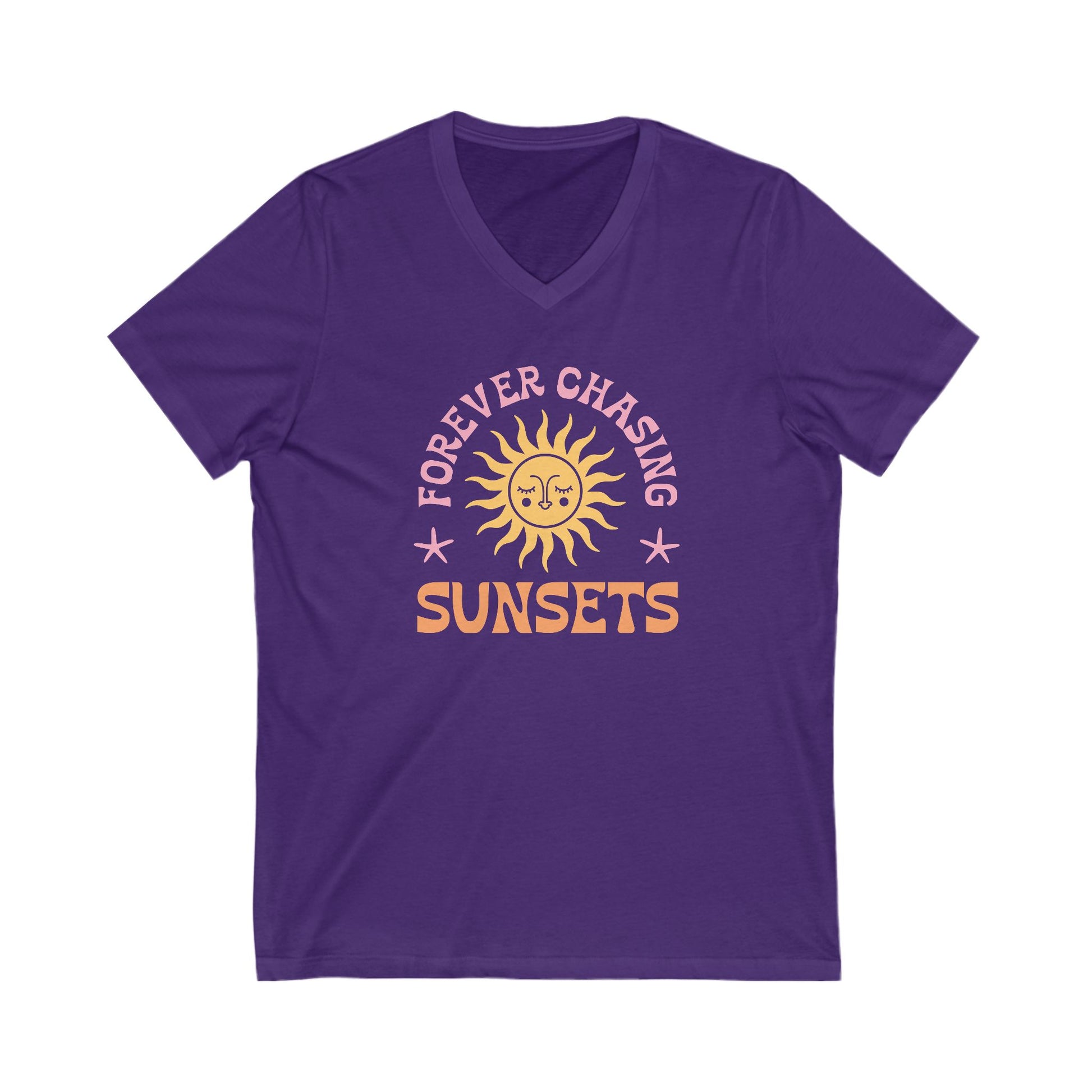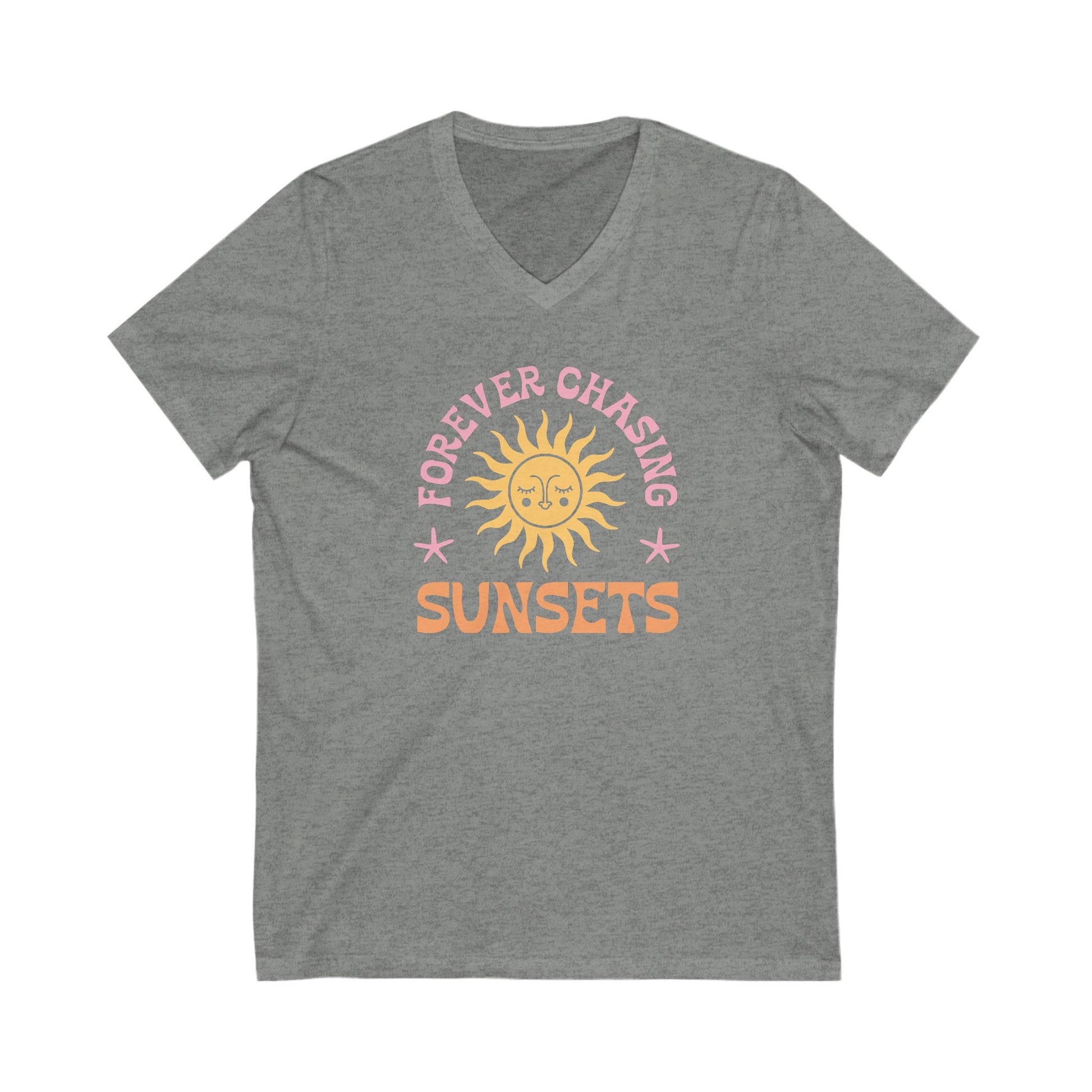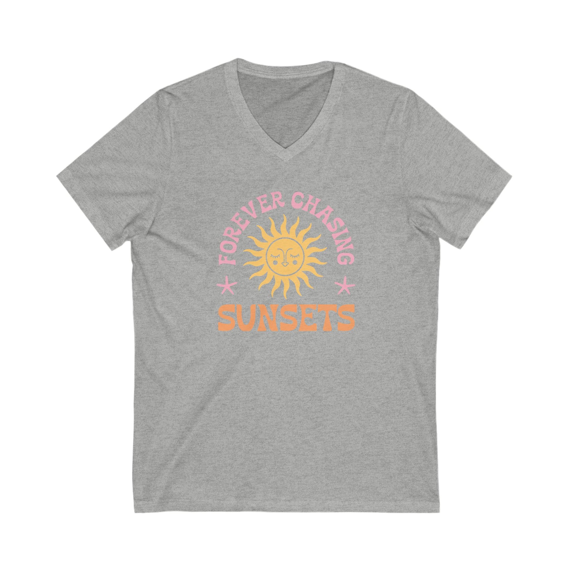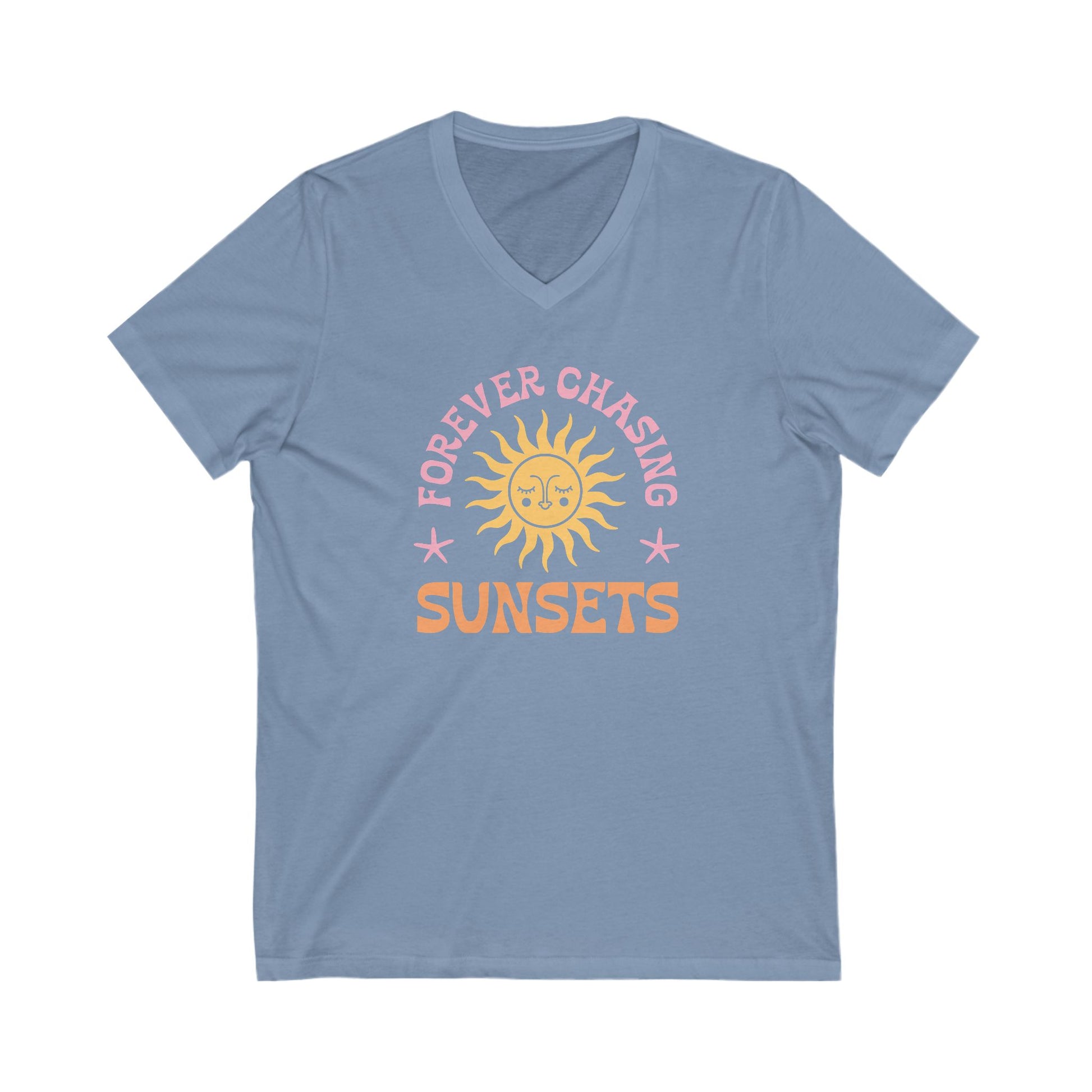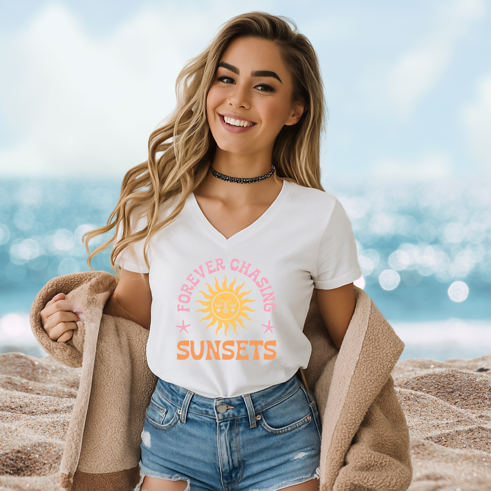 Capture the magic of golden hour with the Forever Chasing Sunsets V-Neck Tee, a perfect blend of effortless style and everyday comfort. Lightweight and versatile, this tee pairs beautifully with jeans, shorts, or skirts, making it ideal for beach days, weekend getaways, or casual evenings out. Designed for travelers and dreamers, it’s the ultimate wardrobe essential that celebrates carefree living. Add this sunset-inspired tee to your collection and enjoy timeless style wherever your adventures lead.