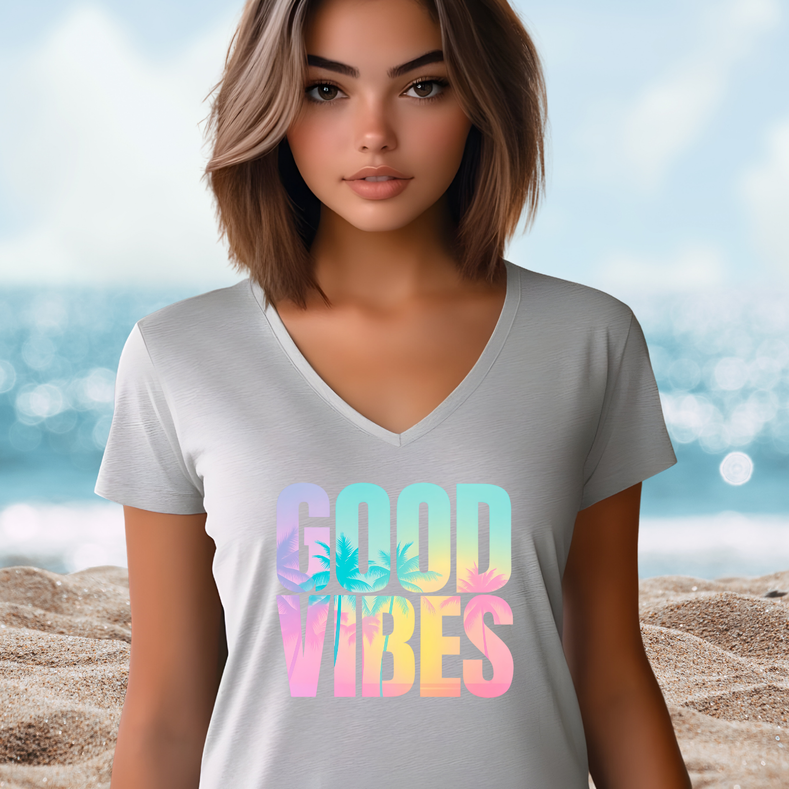 Step into effortless style with the Good Vibes Summer V-Neck Tee, the perfect blend of casual comfort and tropical flair. This lightweight summer shirt is ideal for beach days, weekend outings, or everyday wear, keeping you cool while showcasing a carefree attitude. With its flattering v-neckline and versatile fit, it’s easy to pair with shorts, jeans, or skirts. Spread positivity and capture the essence of summer with this must-have graphic tee that brings sunshine everywhere you go.