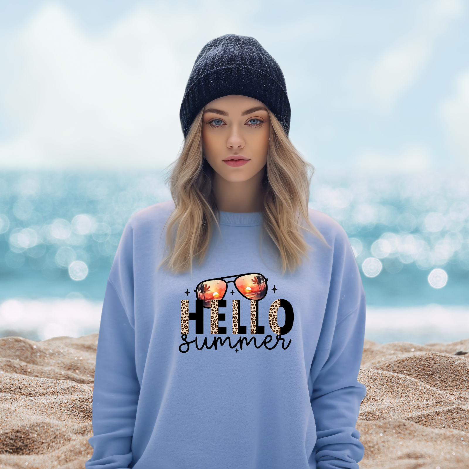 Stay cozy and stylish all season long with the Hello Summer Crewneck Sweatshirt, designed to bring warm beach vibes to cooler days. This trendy sweatshirt offers premium comfort and a relaxed fit, perfect for layering during summer nights or casual outings. Featuring vibrant sunset and palm tree elements with chic leopard print accents, it’s an ideal addition to your summer wardrobe. Elevate your casual look with this must-have summer sweatshirt today.