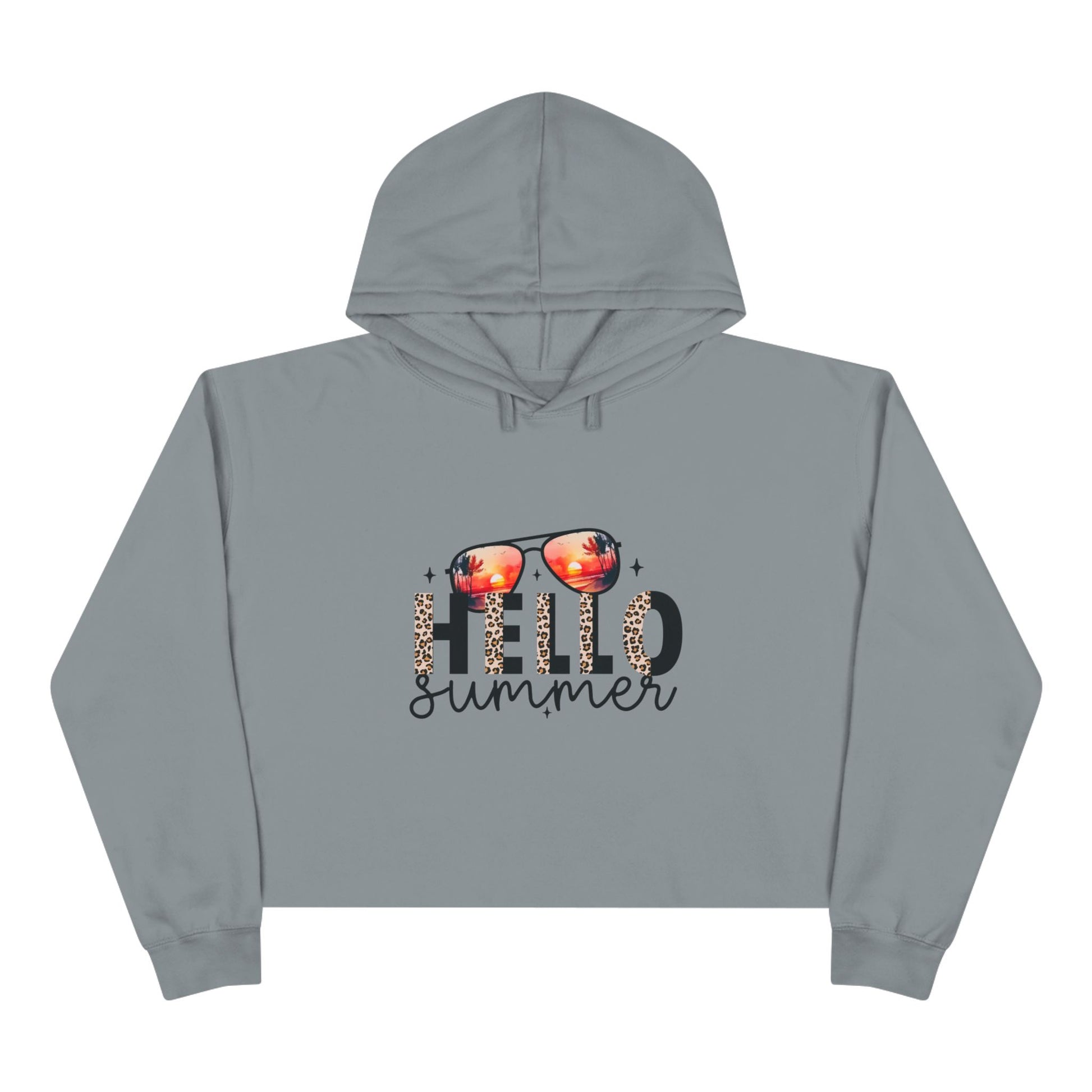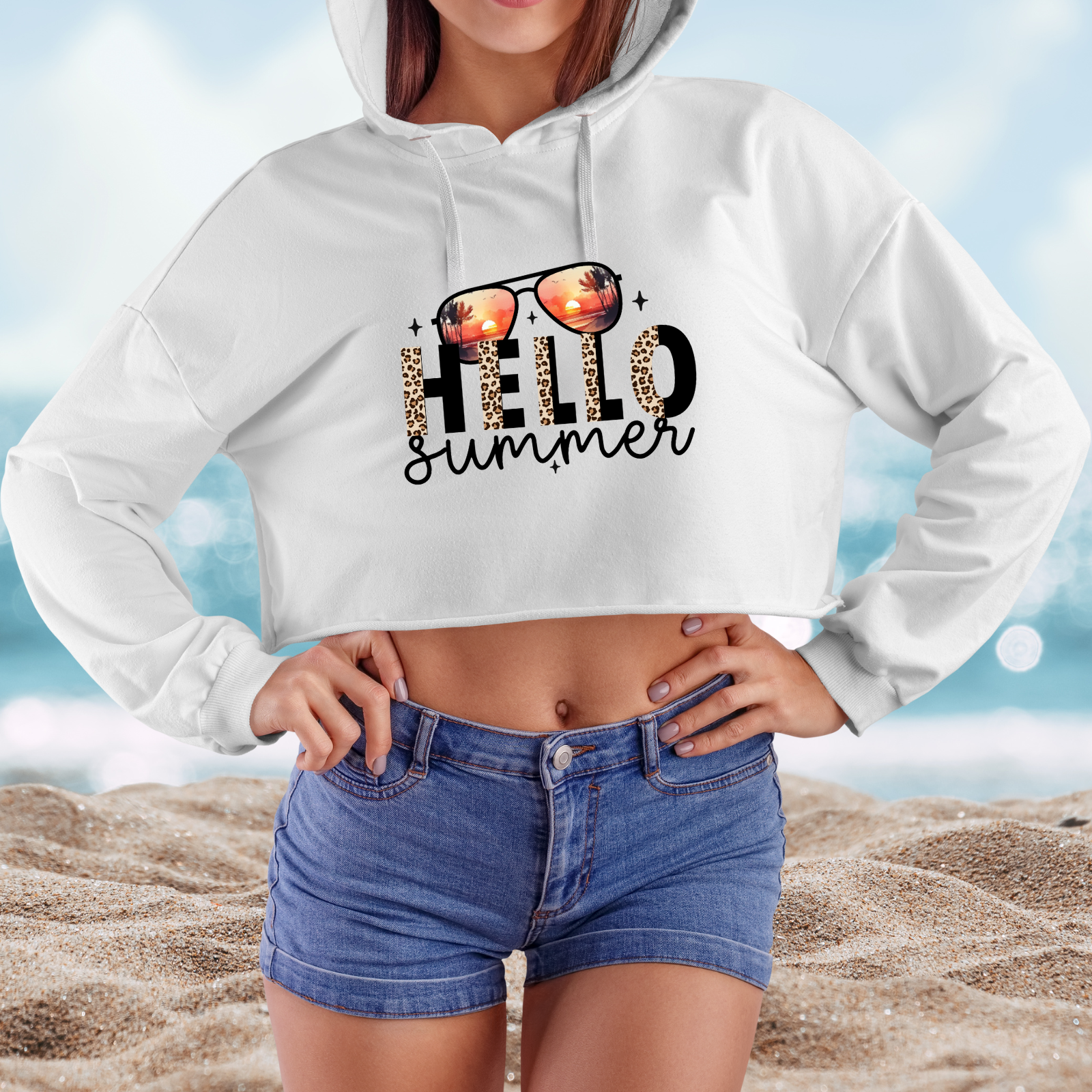 Embrace summer vibes in style with the Hello Summer Crop Hoodie, perfect for those warm days and breezy nights. This trendy crop hoodie combines comfort and fashion with a flattering fit, making it an essential summer wardrobe piece. Featuring eye-catching sunset and palm tree graphics paired with chic leopard print details, it’s designed for casual outings and festivals. Elevate your summer look with this must-have crop hoodie and stay effortlessly cool.