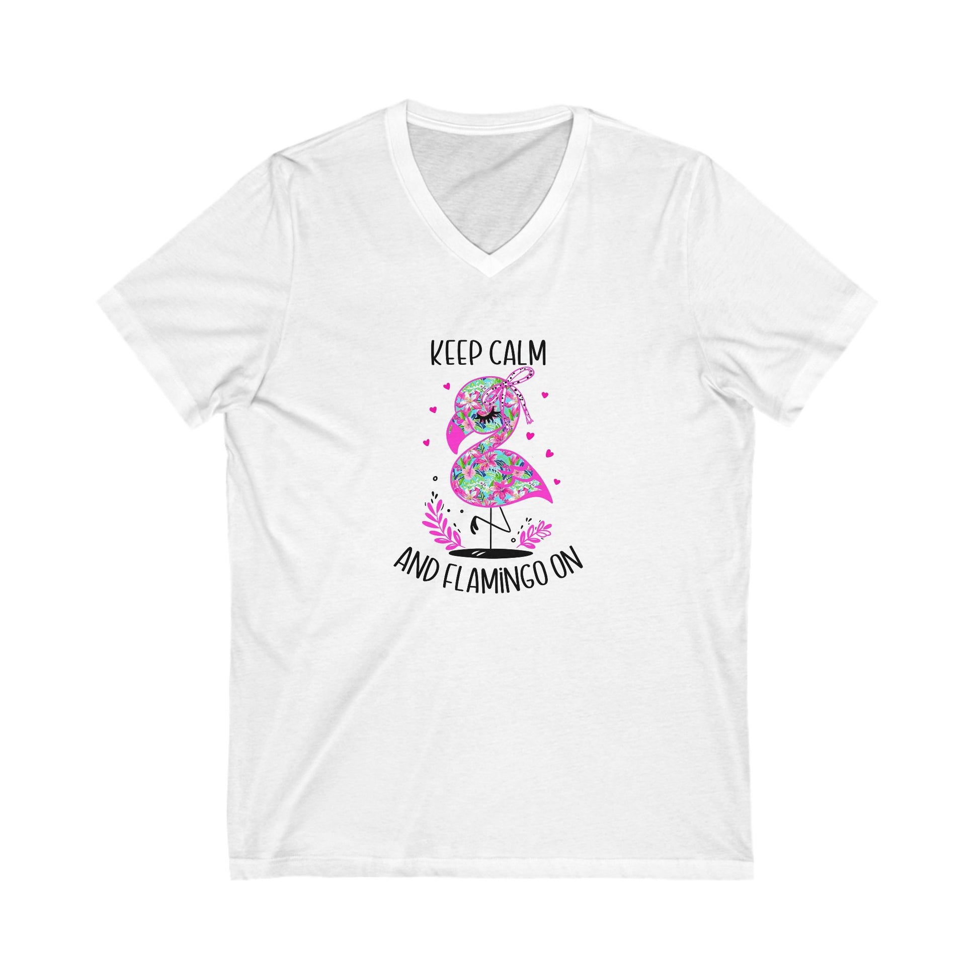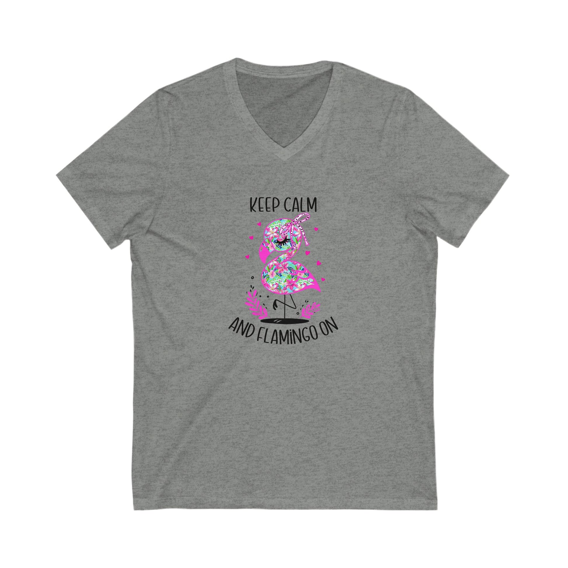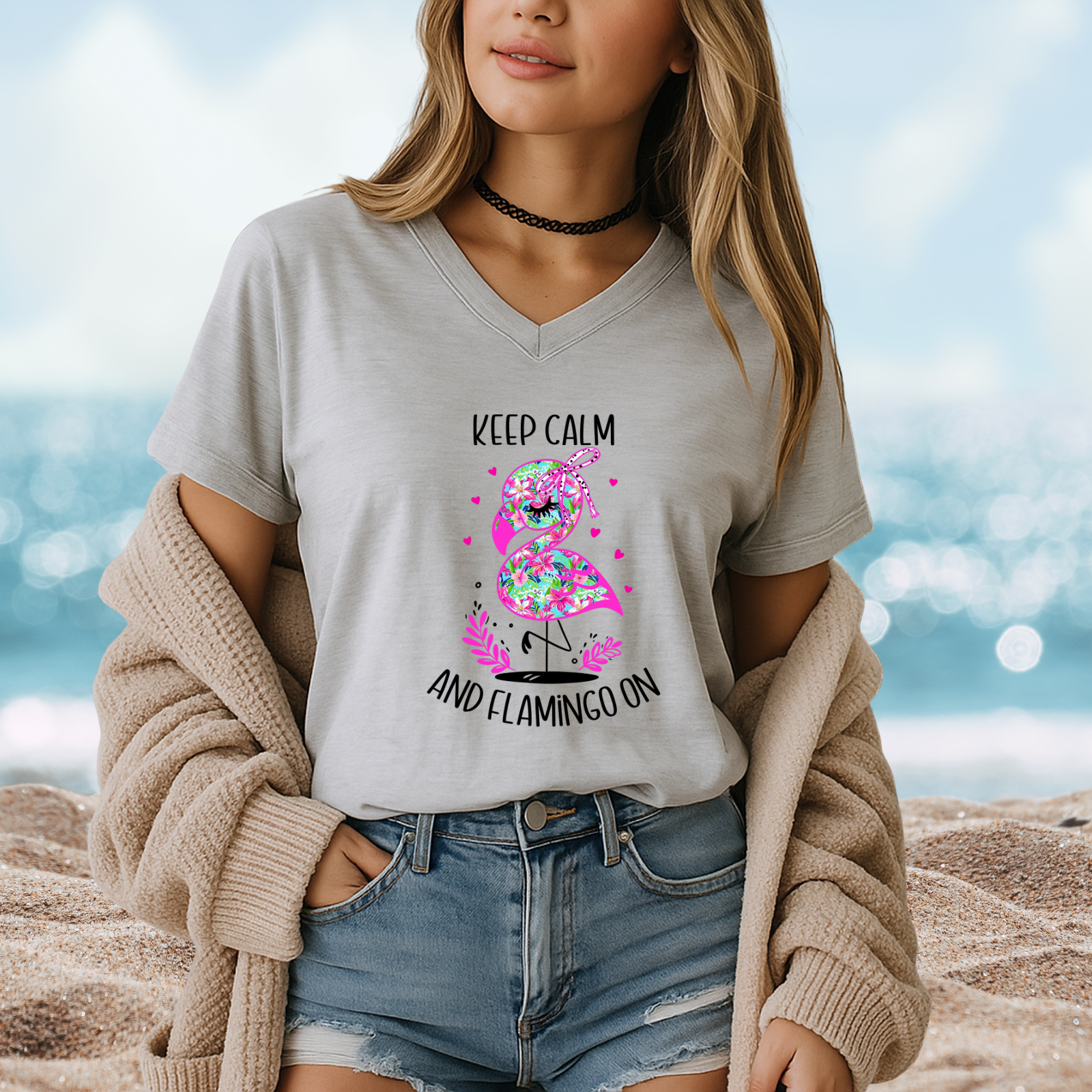 Bring a touch of tropical charm to your wardrobe with the Keep Calm and Flamingo On V-Neck Tee, the perfect choice for summer fun. This stylish tee offers a flattering fit while keeping you cool and comfortable for beach days, vacations, or casual outings. With its playful flamingo-inspired design and lightweight fabric, it’s a go-to piece for effortless warm-weather style. Pair it with shorts, skirts, or jeans to add personality and sunshine vibes to your everyday look.