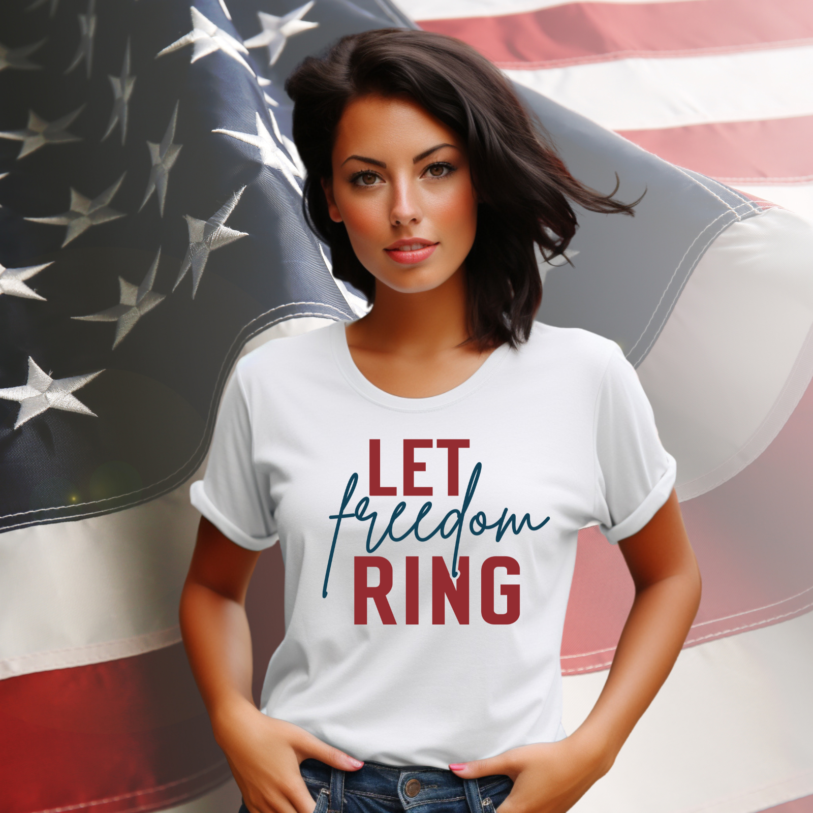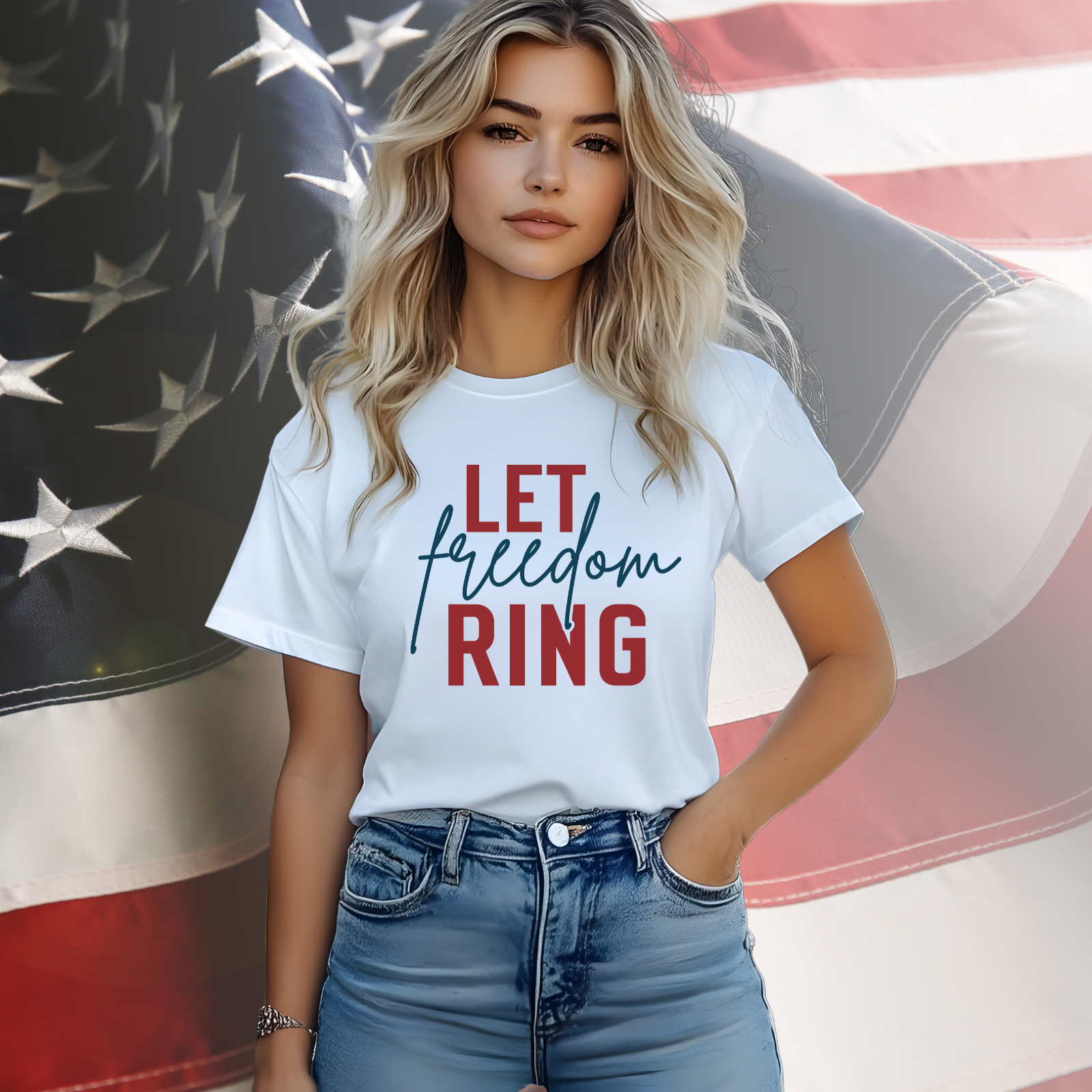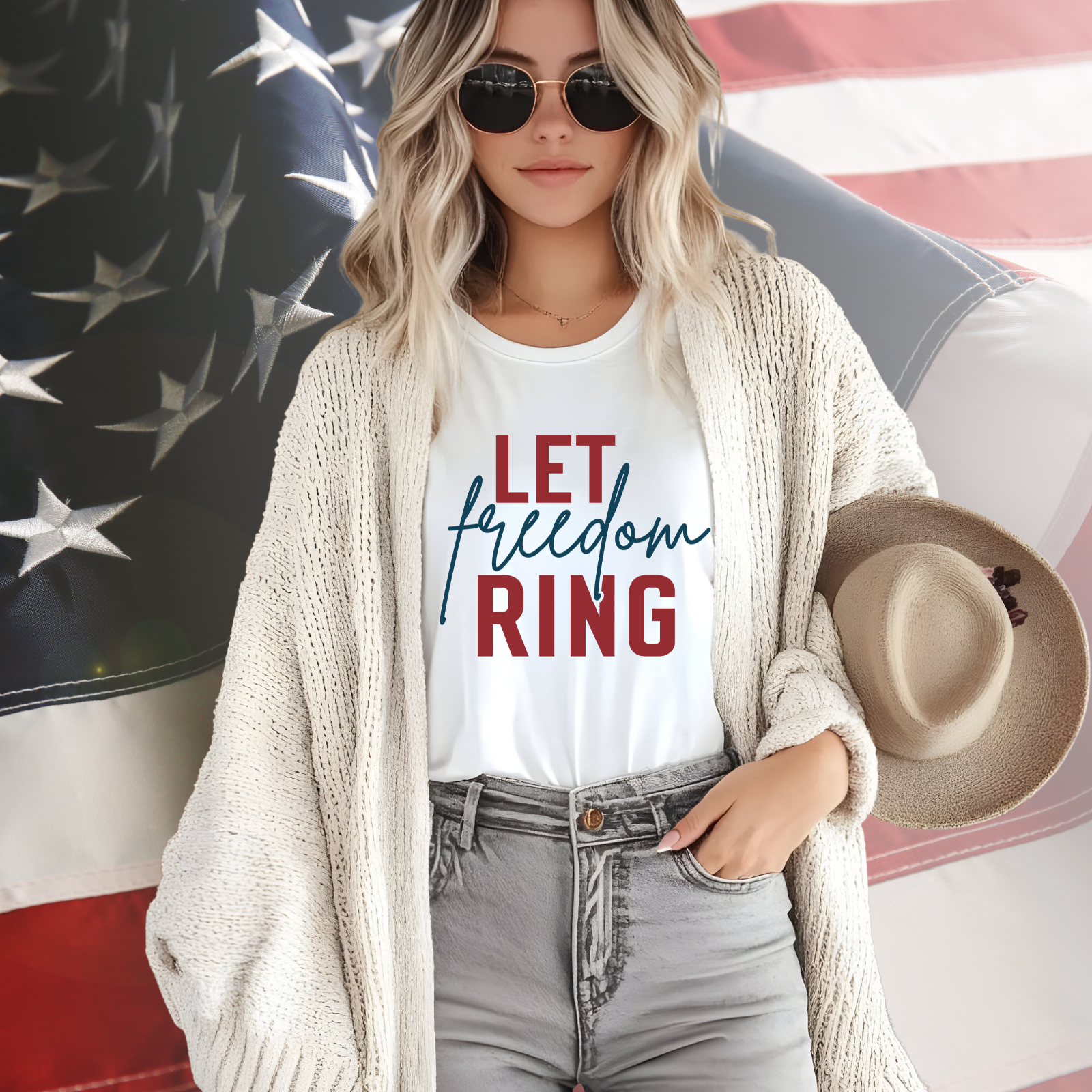 Let Freedom Ring in effortless style with this patriotic T-Shirt that celebrates freedom and positivity. Whether you're headed to a summer picnic, holiday celebration, or simply want to share an uplifting message, this tee makes it easy to express your values. With a soft, comfortable fit and a spirit of inspiration, it's perfect for pairing with jeans or layering for any season. Show your love for country and kindness with this meaningful and versatile wardrobe staple.