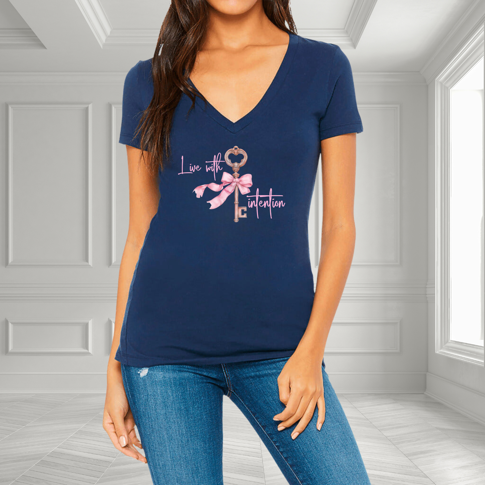 Embrace purpose with style in the Live with Intention V-Neck T-Shirt. Crafted for those who value both elegance and mindfulness, this soft V-neck tee inspires you to live each day with meaning. Ideal for pairing with any look, it’s a perfect addition for those seeking both comfort and inspiration. Elevate your wardrobe with a touch of purpose, making every casual day an opportunity to live with intention and charm.