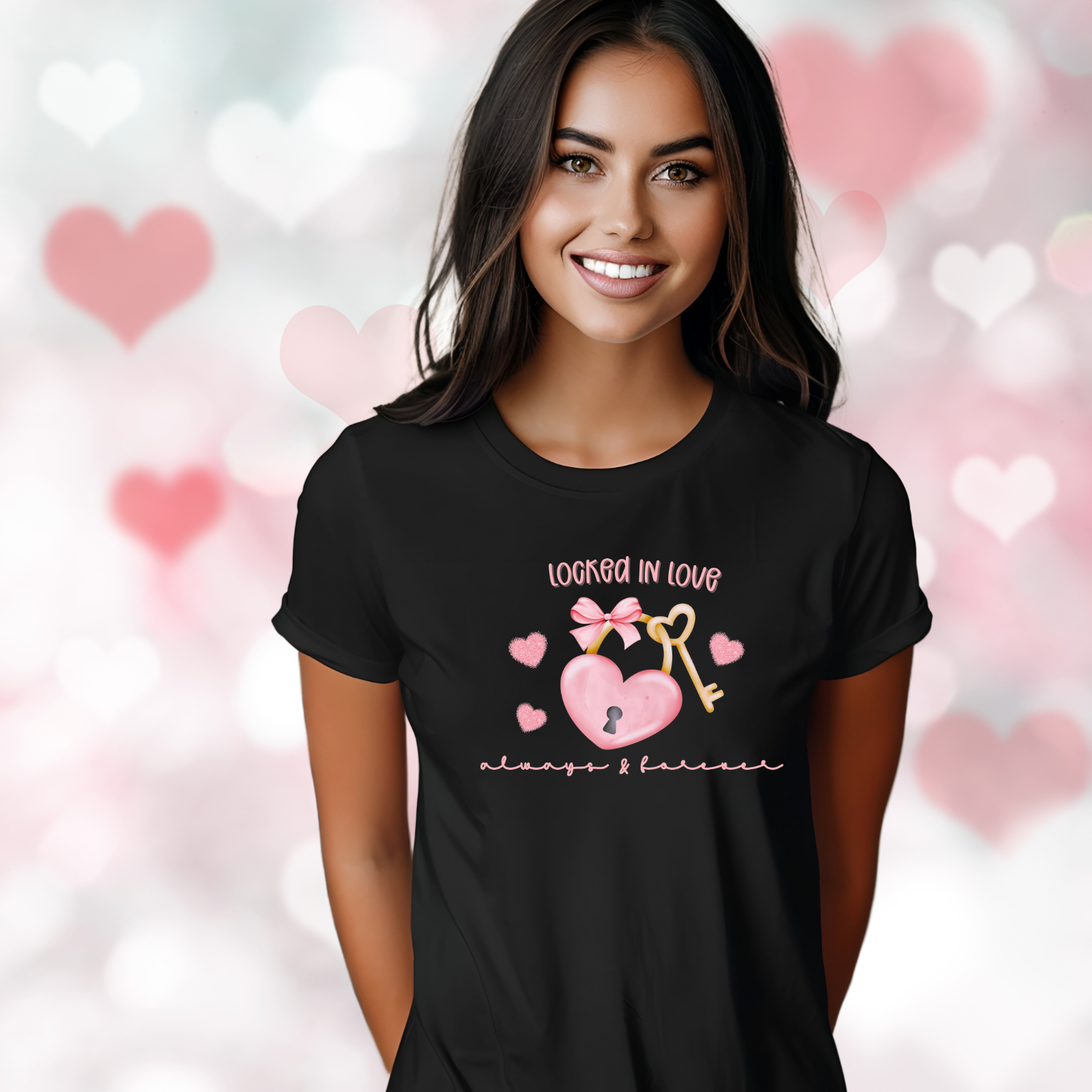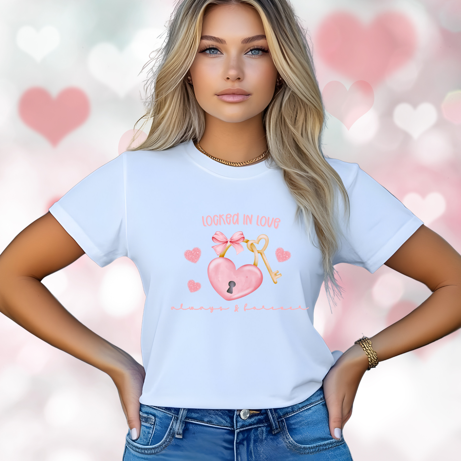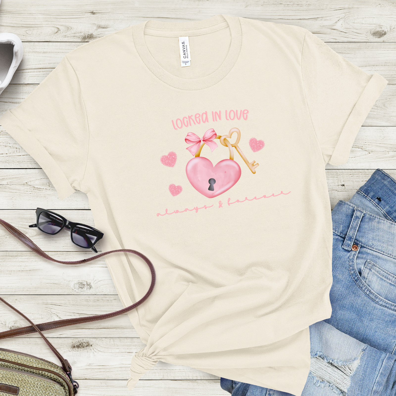Embrace the spirit of love with our Locked in Love T-Shirt, perfect for adding a touch of romance to your wardrobe. Featuring a coquette inspired graphic, this shirt blends charm and style effortlessly. Ideal for Valentine’s Day or a casual day out, the soft fabric and flattering fit make it a comfortable choice for any occasion. Show off your love in a fashionable way and make this timeless piece a staple in your closet today!
