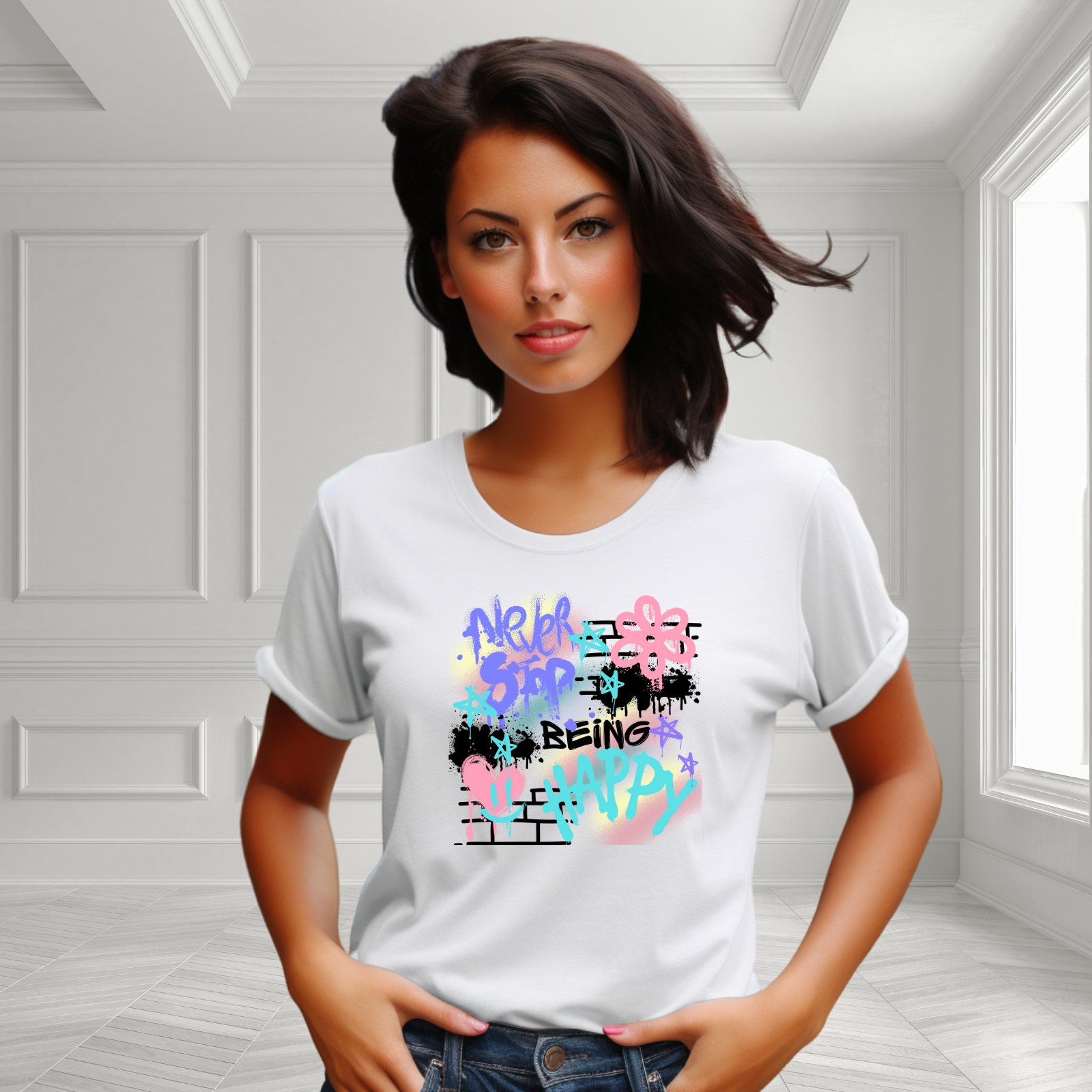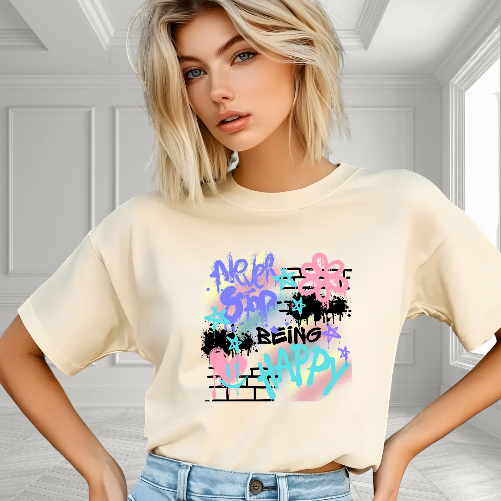 Stay positive and stylish with the Never Stop Being Happy T-Shirt. This trendy tee is crafted from ultra-soft, breathable fabric, offering all-day comfort and a relaxed fit. Perfect for casual outings or lounging, it effortlessly elevates your look while inspiring good vibes. Its versatile design pairs easily with jeans, shorts, or leggings, making it a must-have addition to your wardrobe. Elevate your everyday style with this feel-good tee that celebrates happiness and self-expression.