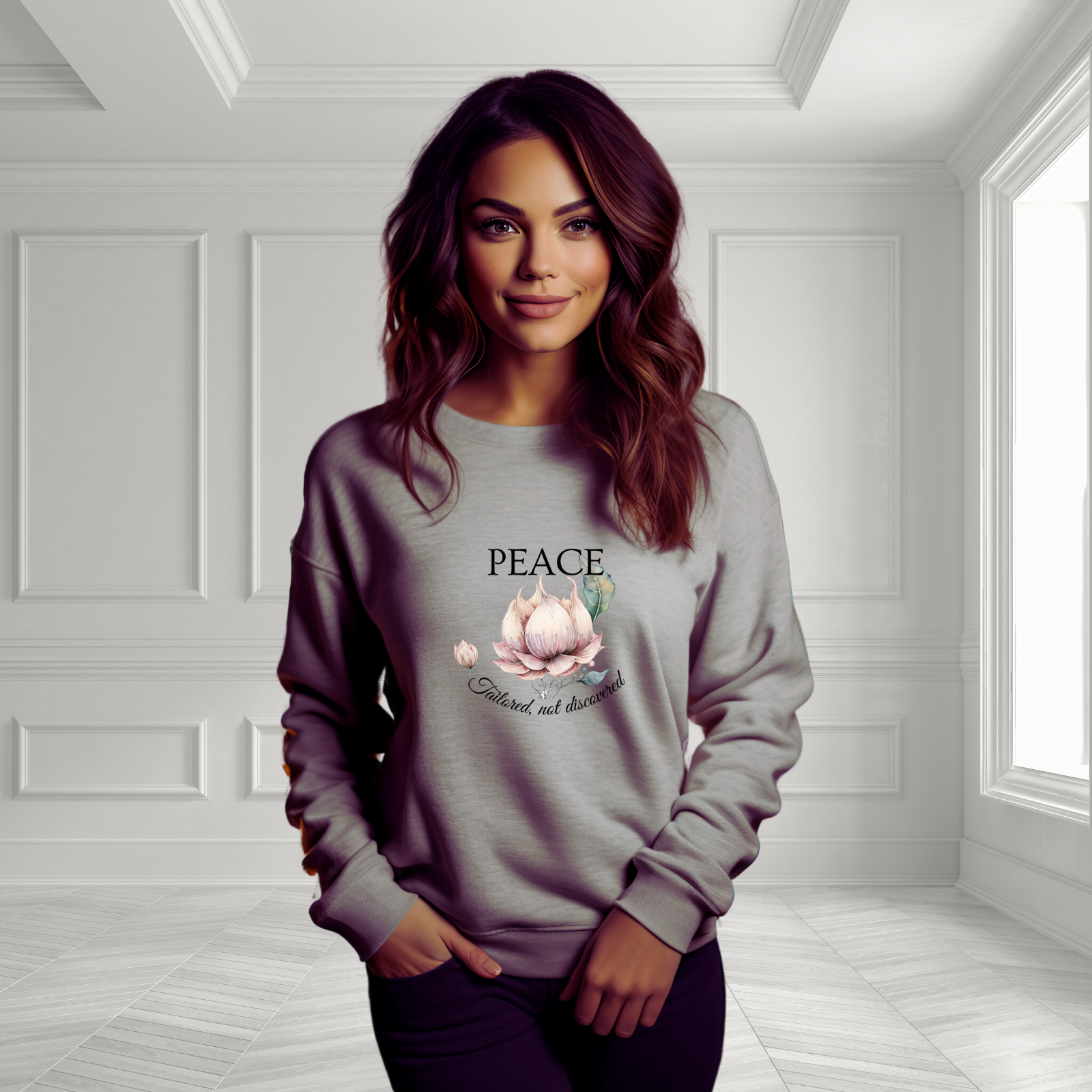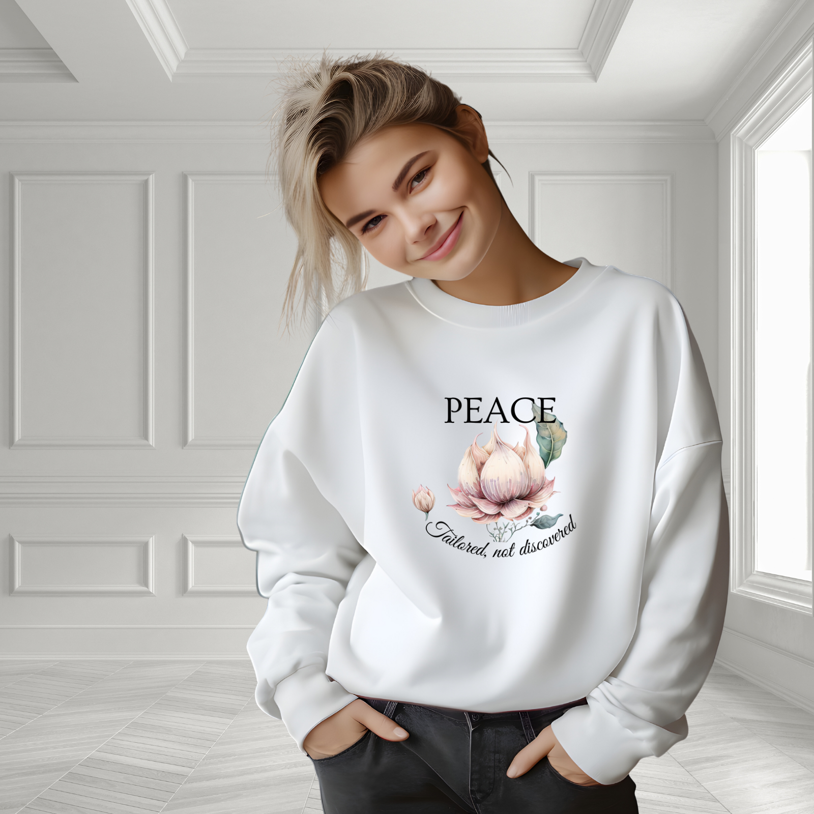 Elevate your cozy wardrobe with the Peace - Tailored, Not Discovered Crewneck Sweatshirt. Crafted for comfort and style, this soft, premium sweatshirt offers a relaxed fit perfect for layering or wearing solo. The minimalist design adds a peaceful touch to your everyday look, ideal for casual outings or lounging at home. Its versatile style pairs seamlessly with jeans or leggings, making it a must-have addition to your collection. Embrace comfort and peace with this essential sweatshirt.